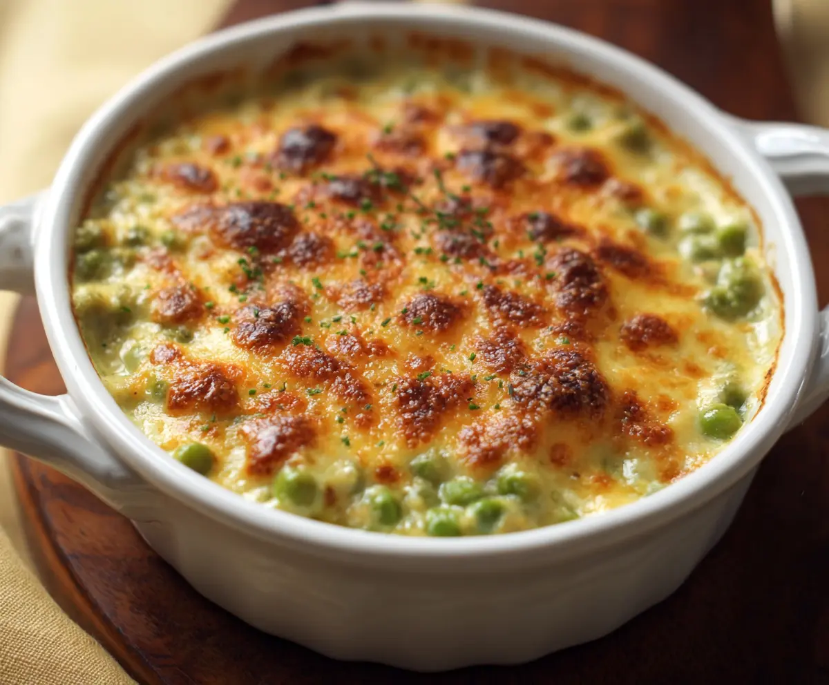 Delicious Au Gratin Creamed Peas with golden melted cheese on top, served as a savory side dish.