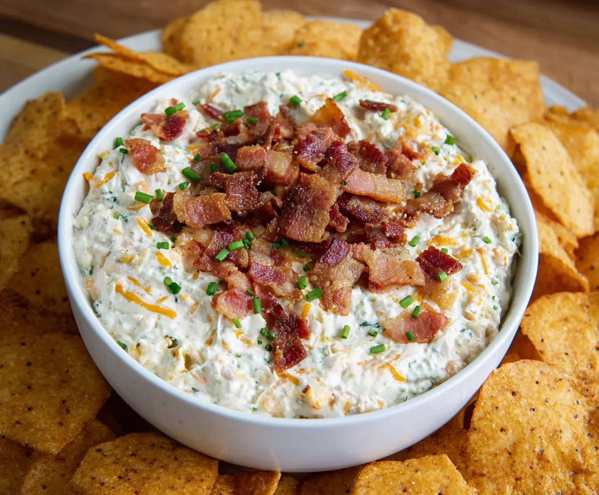 This Bacon Cheddar Ranch Dip is creamy, cheesy, and topped with crispy bacon. It’s perfect for game nights or as a fun snack with chips or veggies!