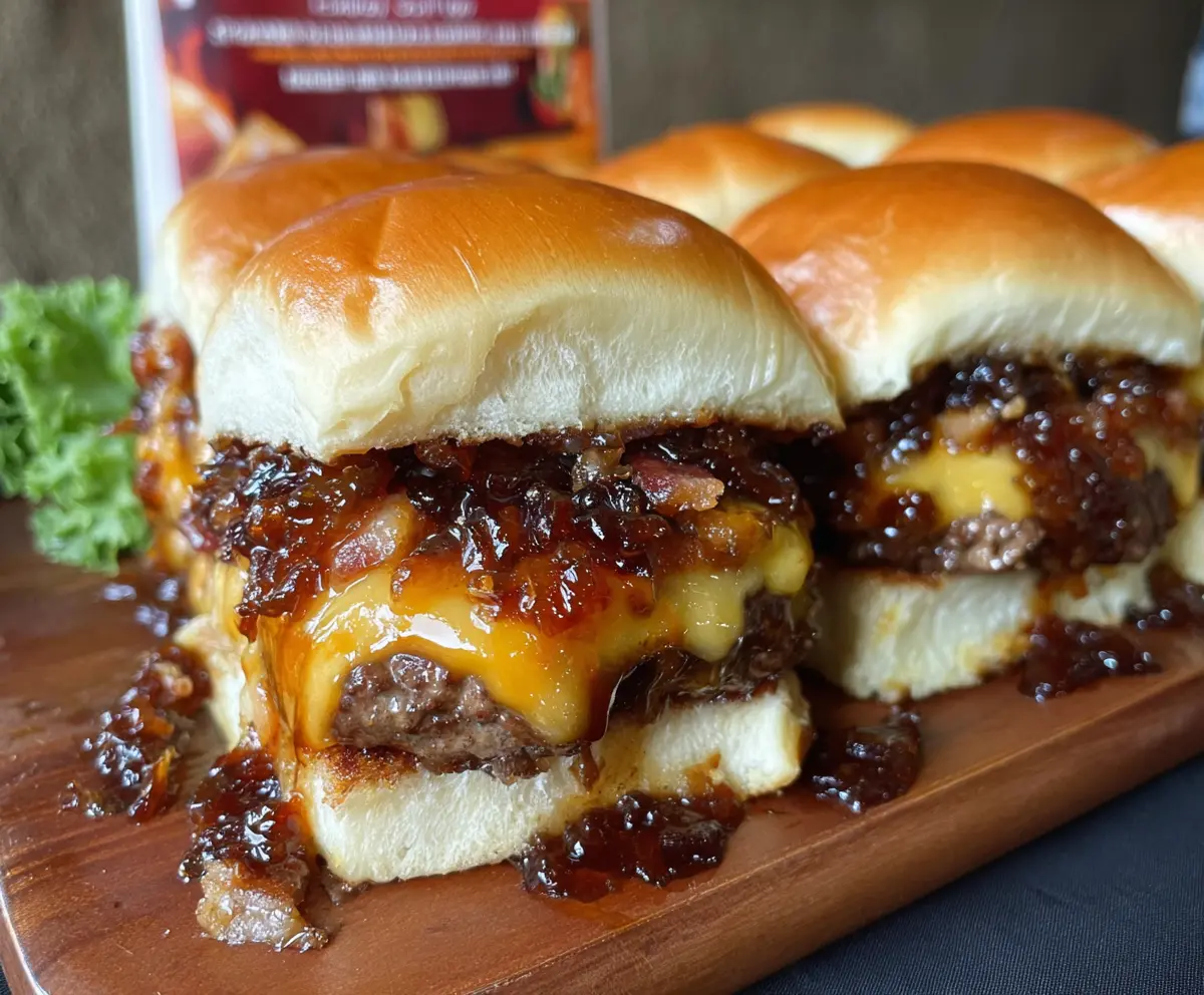 Close-up of Bacon Jam Cheeseburger Sliders with melted cheese and crispy bacon on soft slider buns.