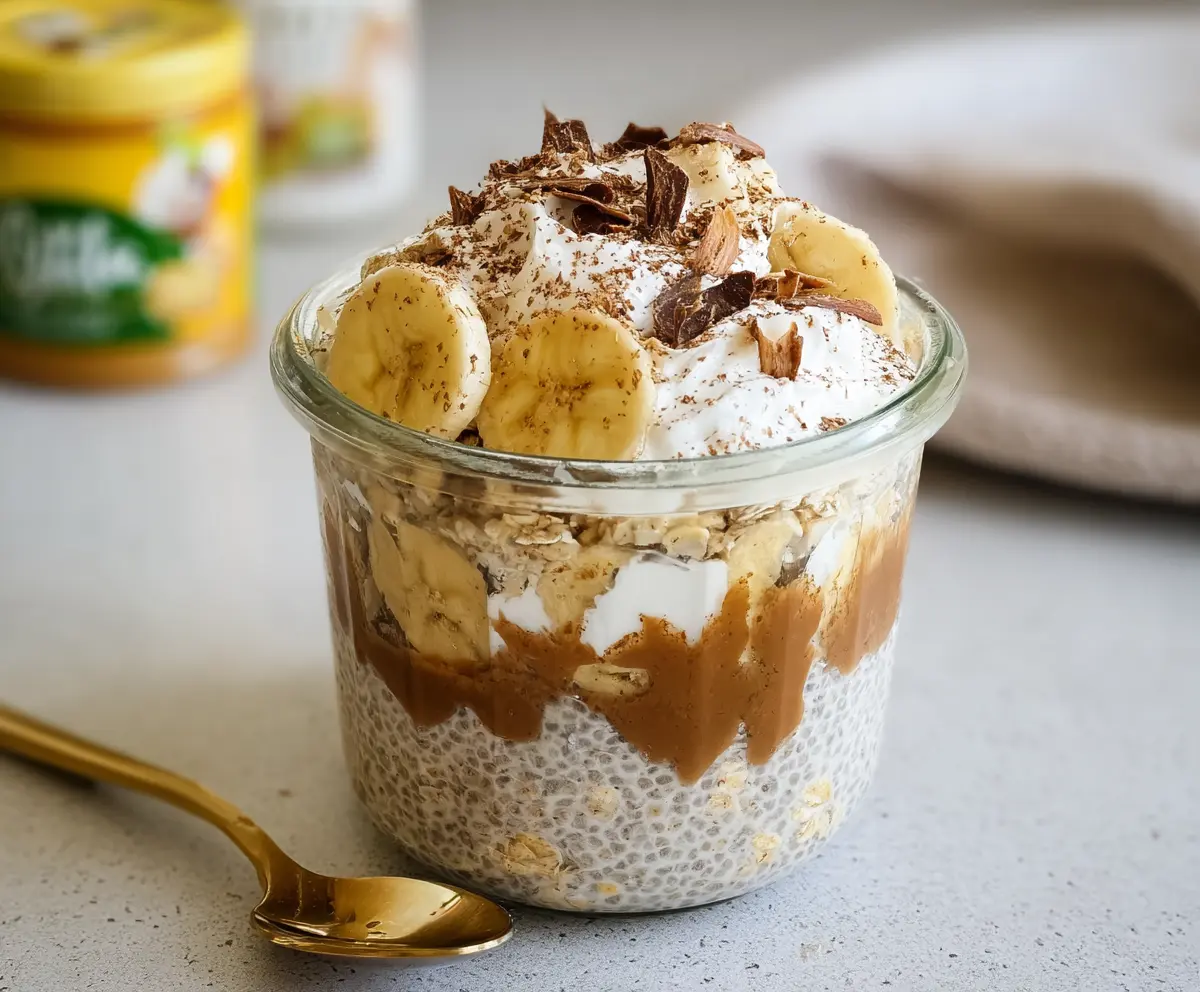 This recipe captures the delightful flavors of banoffee pie with layers of banana, creamy peanut butter, oats, and whipped cream, making it a perfect start to your day!