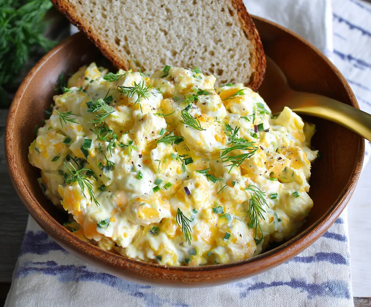 Transfer the egg salad to a nice serving bowl. For the finishing touch, sprinkle it with a pinch of smoked paprika or chili flakes and add some extra chives on top. This recipe is great served chilled or at room temperature and pairs perfectly with whole-grain toast, crackers, or fresh veggies.
