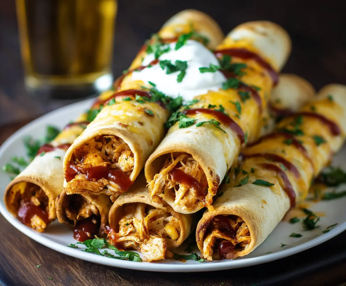 Arrange the taquitos on a serving plate. Drizzle with extra barbecue sauce and sour cream, and sprinkle with chopped fresh cilantro for a burst of flavor.