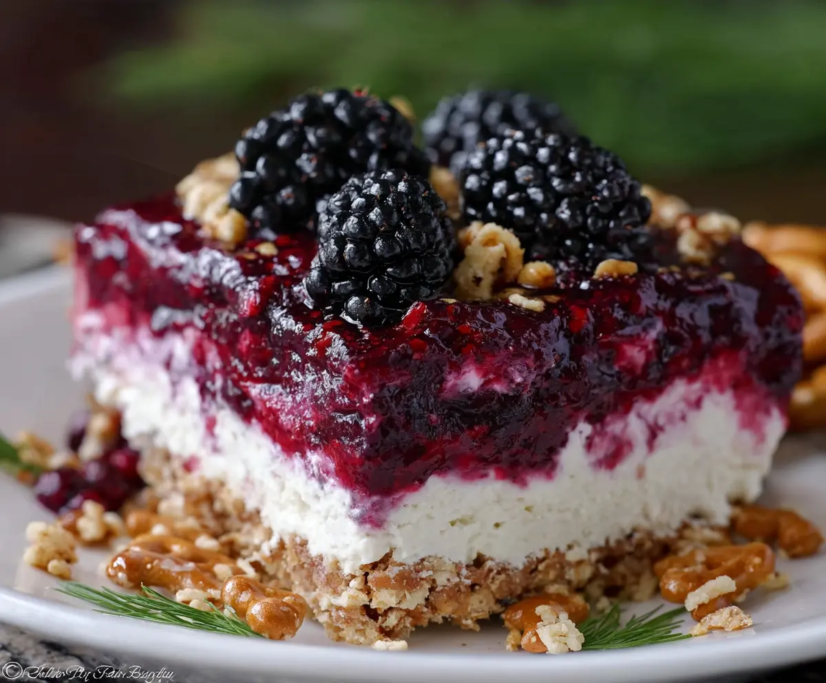 This Blackberry Pretzel Dessert is a fun and tasty treat! It has a crunchy pretzel crust, a creamy layer, and sweet blackberry topping that makes every bite special.