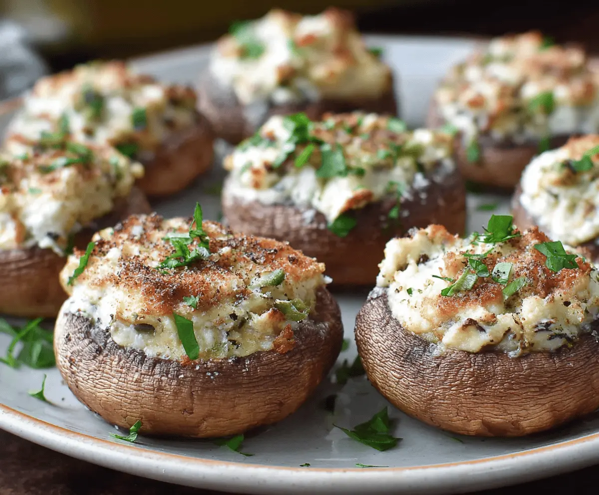 Delicious Boursin stuffed mushrooms garnished with herbs, perfect as an appetizer.