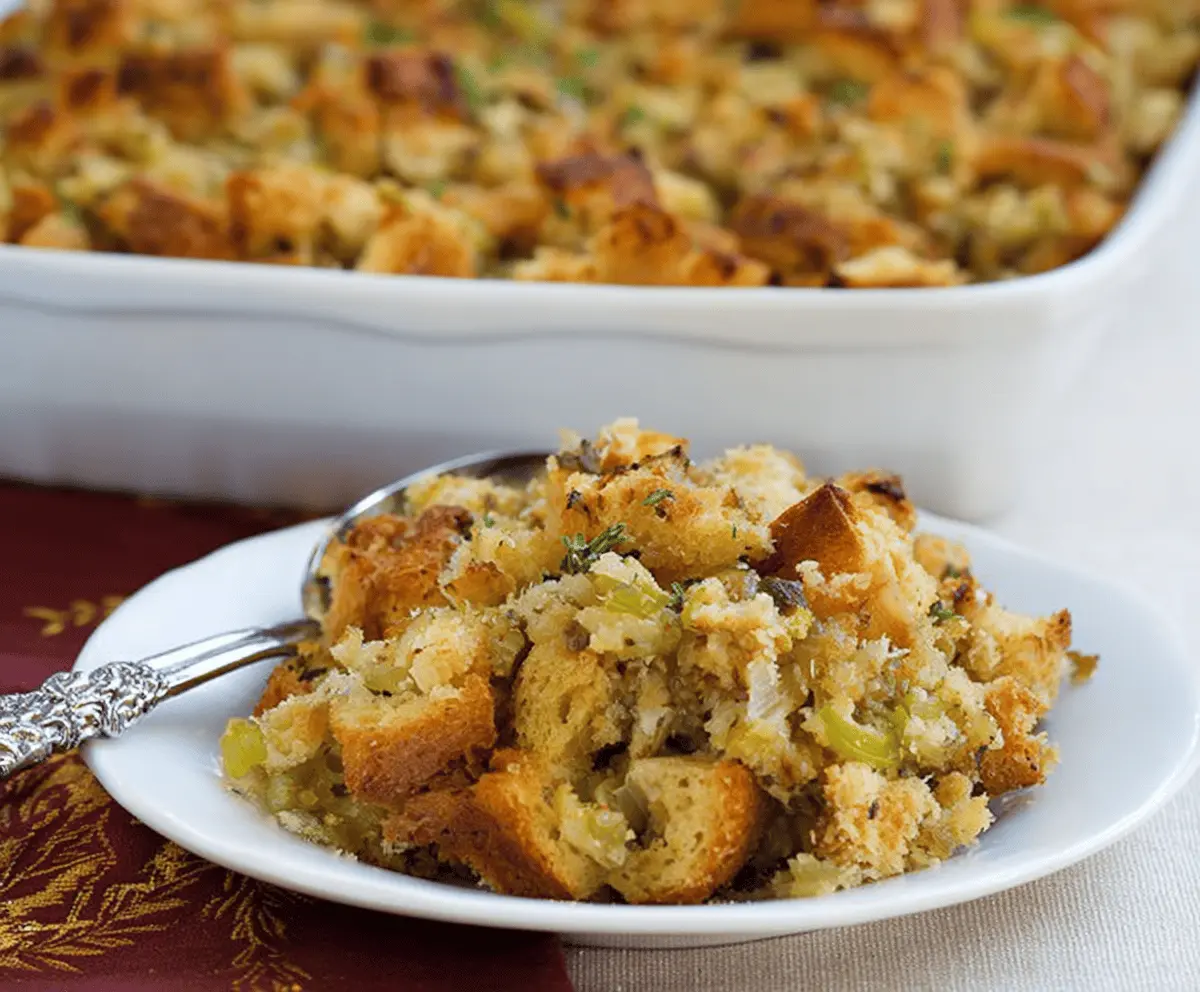 Golden bread stuffing with herbs and vegetables, served as a flavorful holiday side dish.