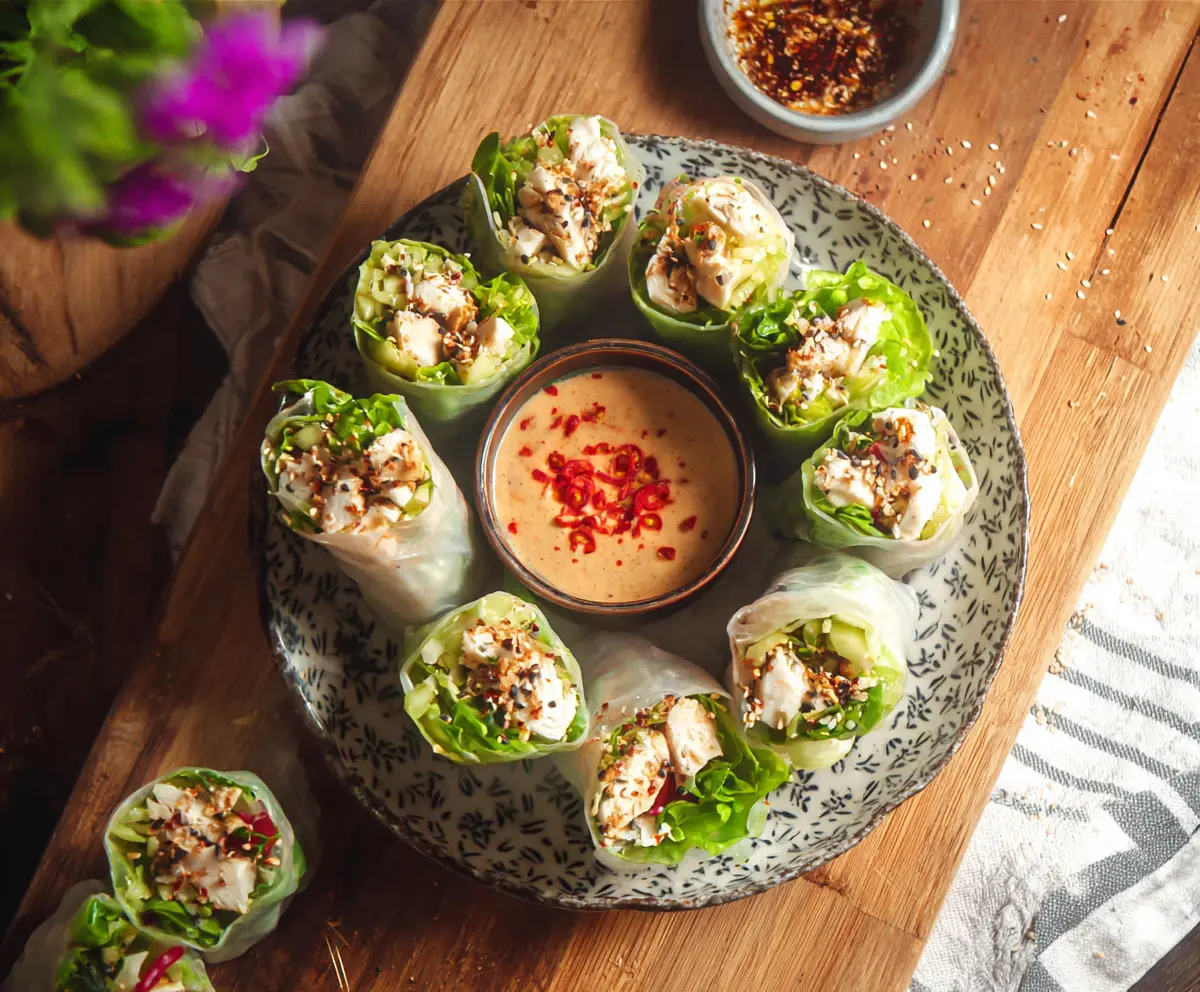 Serve these fresh and crunchy rolls with a bowl of Caesar dressing for dipping, mixed with some extra crushed croutons and a sprinkle of chili flakes if you like a bit of spice. Enjoy your tasty Caesar Chicken Rice Paper Rolls!