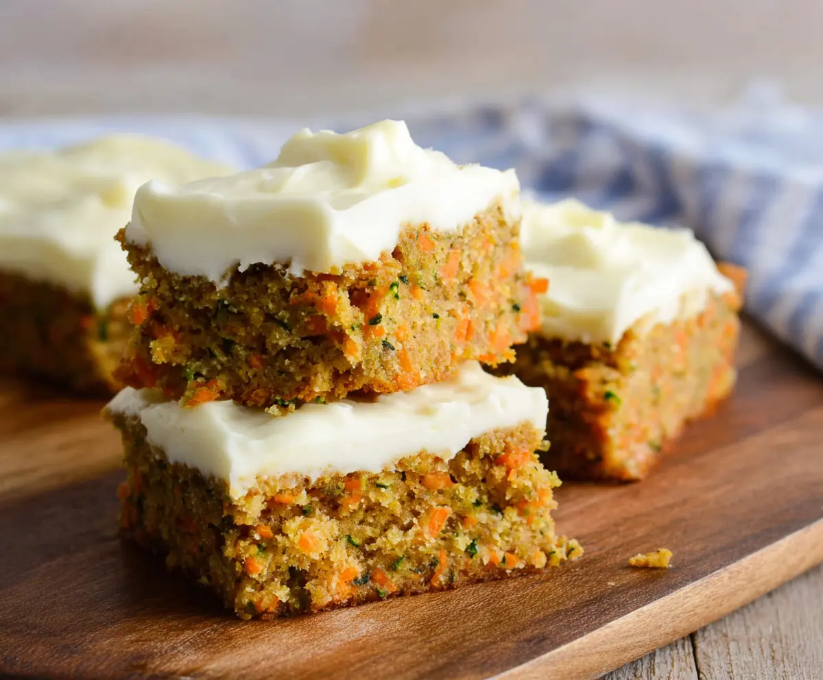 Delicious carrot and zucchini bars topped with citrus cream cheese frosting, perfect for a healthy snack or dessert.