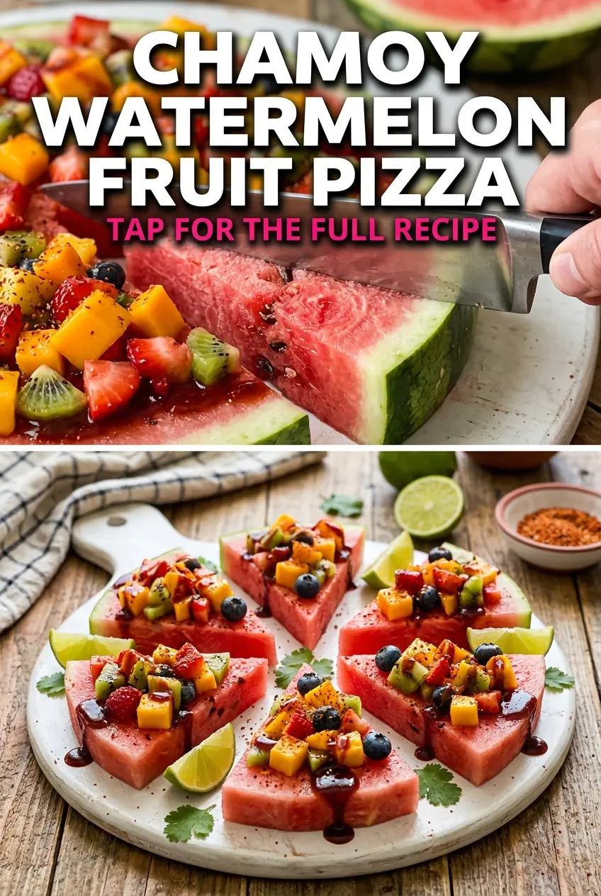 Chamoy watermelon fruit pizza hits the table cold, crisp, and loud in the best way. The watermelon stays juicy and refreshing, but the chamoy, honey, and Tajín turn every slice into that sweet-sour-salty-spicy bite that keeps people reaching back for another piece. It looks playful, but the flavor balance is what makes it worth repeating.