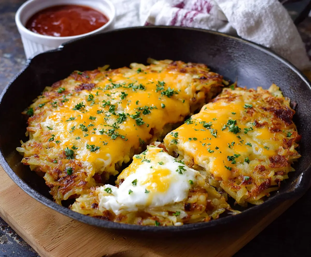 Delicious cheesy egg hash browns served on a plate, perfect for breakfast or brunch.