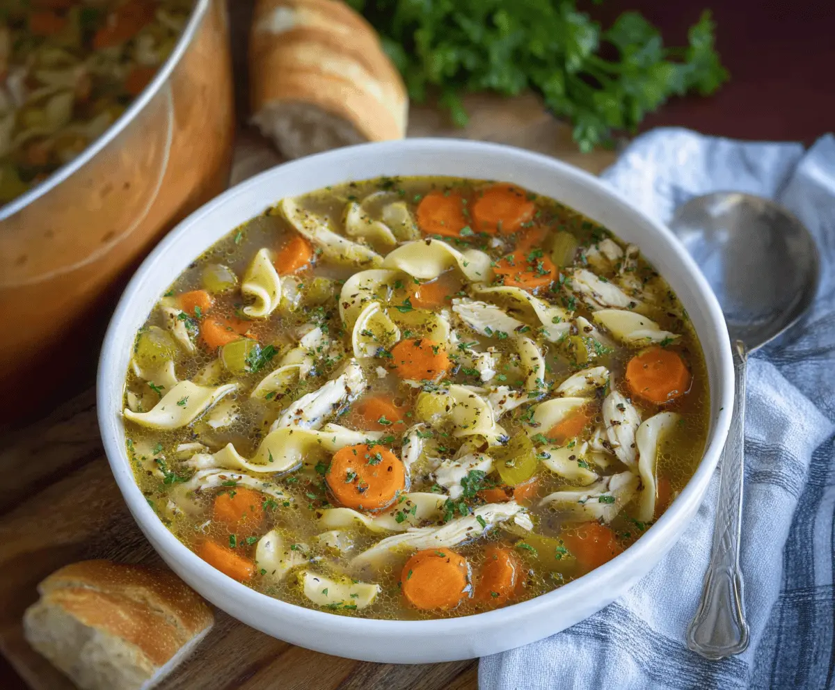 This Chicken Noodle Soup is warm, cozy, and packed with tasty vegetables! Perfect for chilly days, it’s made with tender chicken, soft noodles, and colorful carrots and peas.