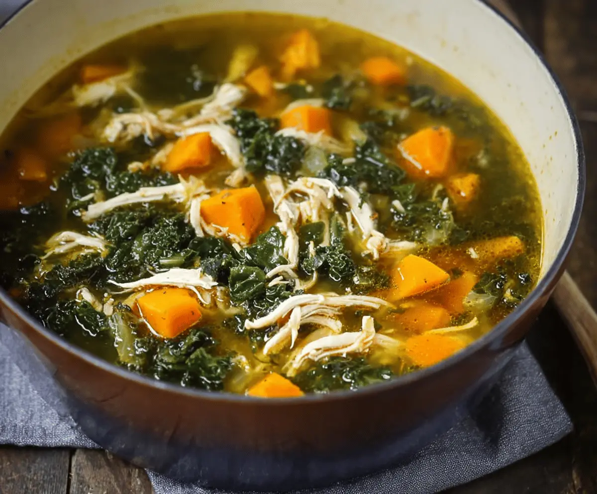Hearty chicken sweet potato kale soup in a bowl, highlighting healthy ingredients and vibrant colors.