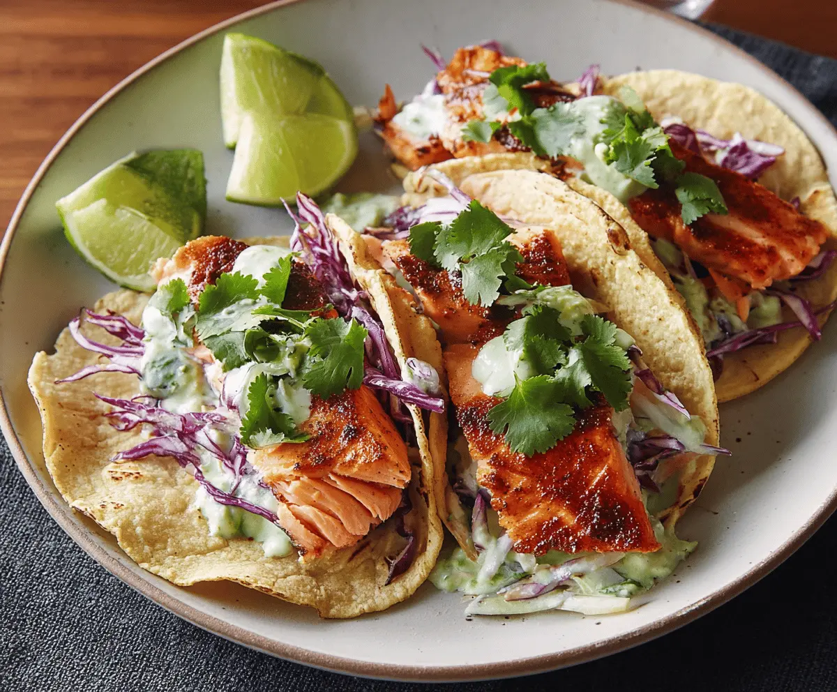 These Chile Lime Salmon Tacos are a delicious treat that brings a burst of flavor in every bite! The salmon is seasoned with zesty spices and paired with fresh toppings, making it both tasty and fun!