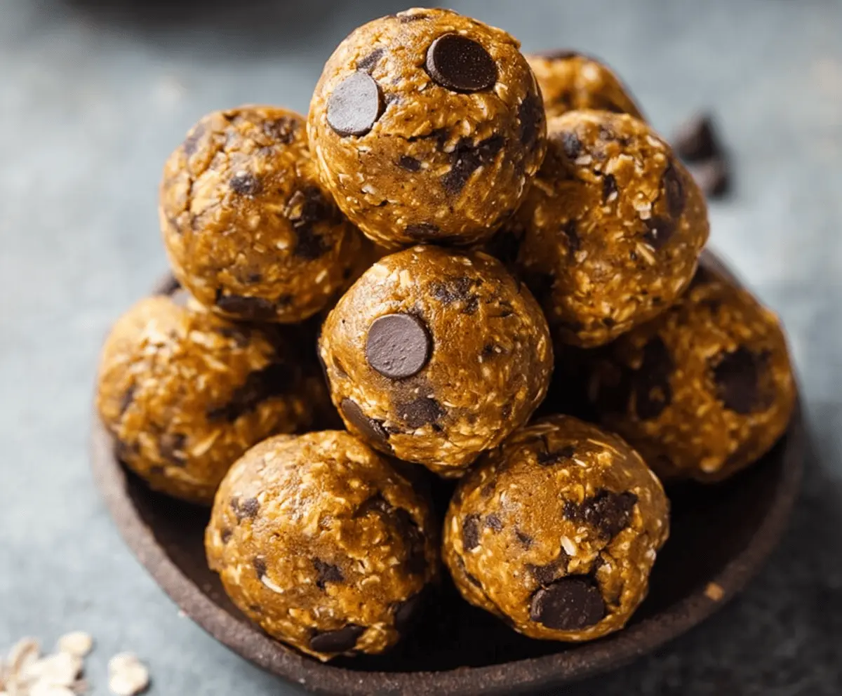 Delicious Chocolate Chip Pumpkin Protein Balls on a white plate, showcasing a healthy, homemade snack with chocolate chips and pumpkin puree.