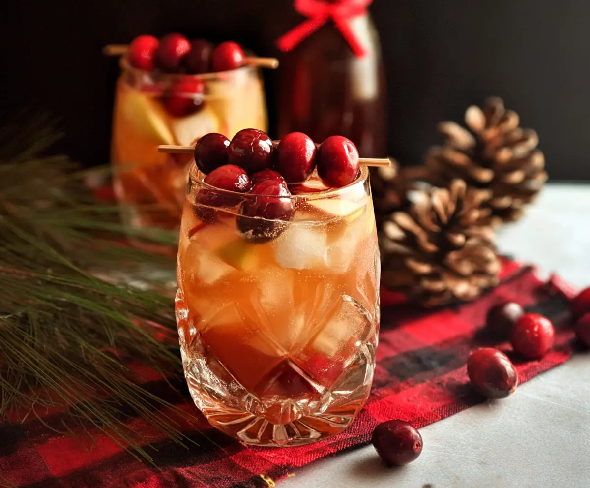 Festive Christmas bourbon cocktails garnished with cinnamon sticks and cherries on a holiday table.