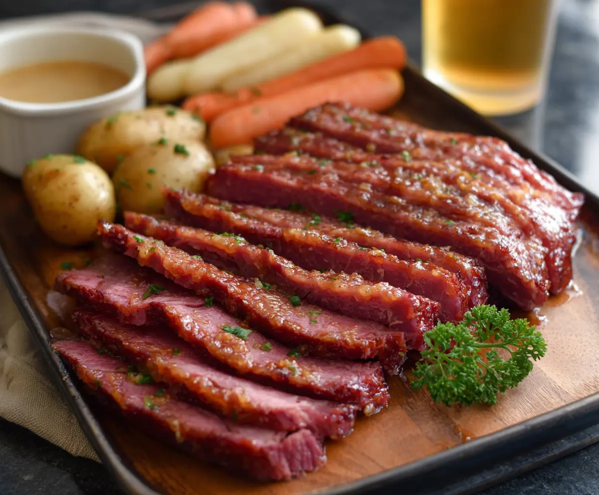 This tasty corned beef gets a special kick from beer glaze, making it fun and flavorful! The glaze adds a sweet and tangy touch, perfect for any dinner.