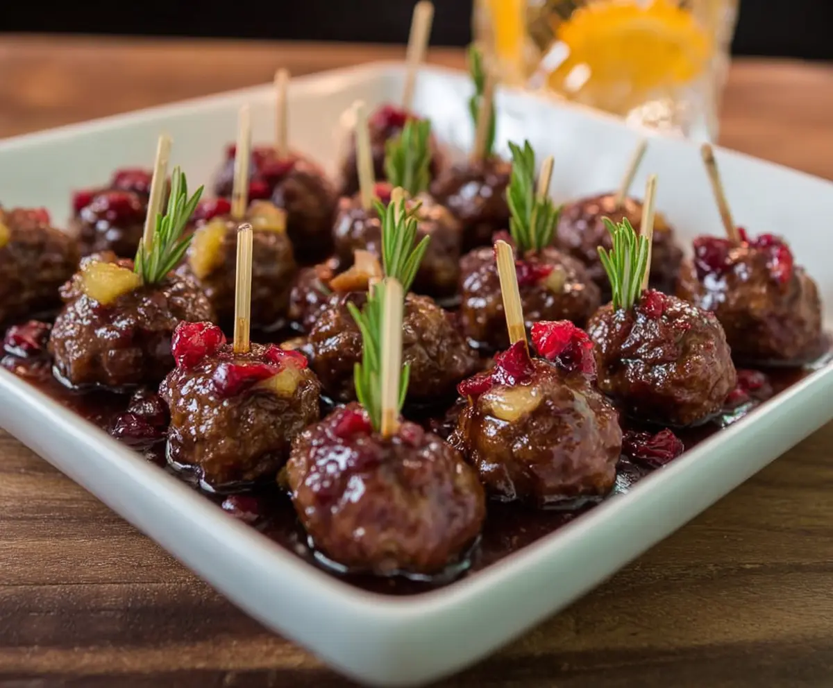 Transfer the sauced meatballs to a serving dish. For a festive touch, garnish each meatball with a toothpick topped with a fresh cranberry, a small cube of orange or yellow bell pepper, and a sprig of rosemary. This not only looks great but adds some extra flavor!