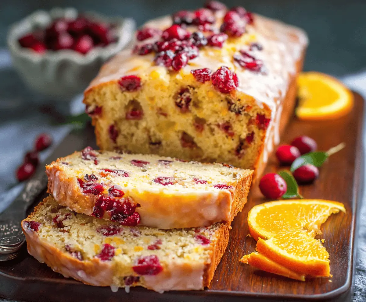 Freshly baked cranberry orange bread with vibrant cranberries and zesty orange zest on a rustic wooden table.