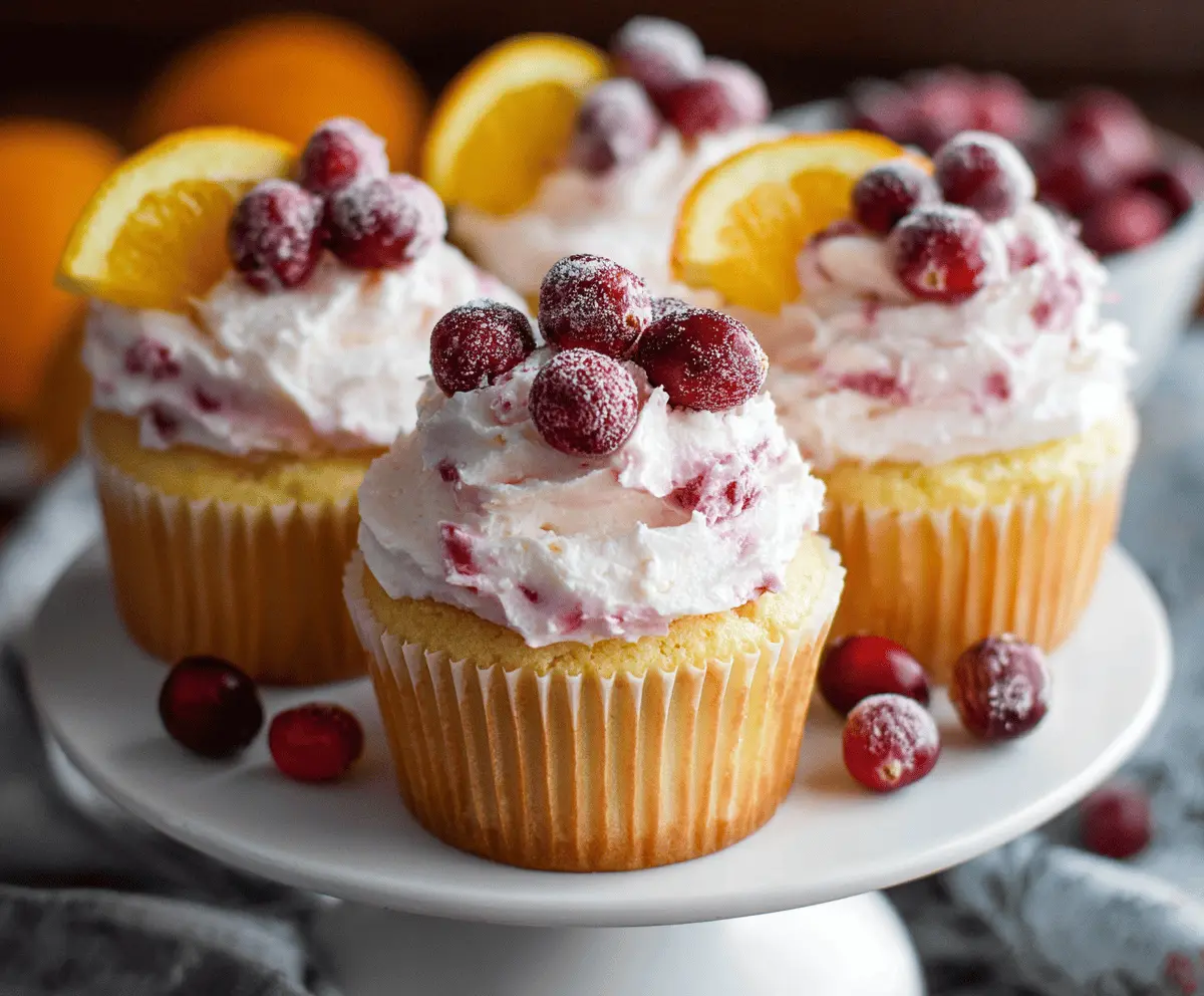 Delicious cranberry orange cupcakes with vibrant orange zest and fresh cranberries on top.
