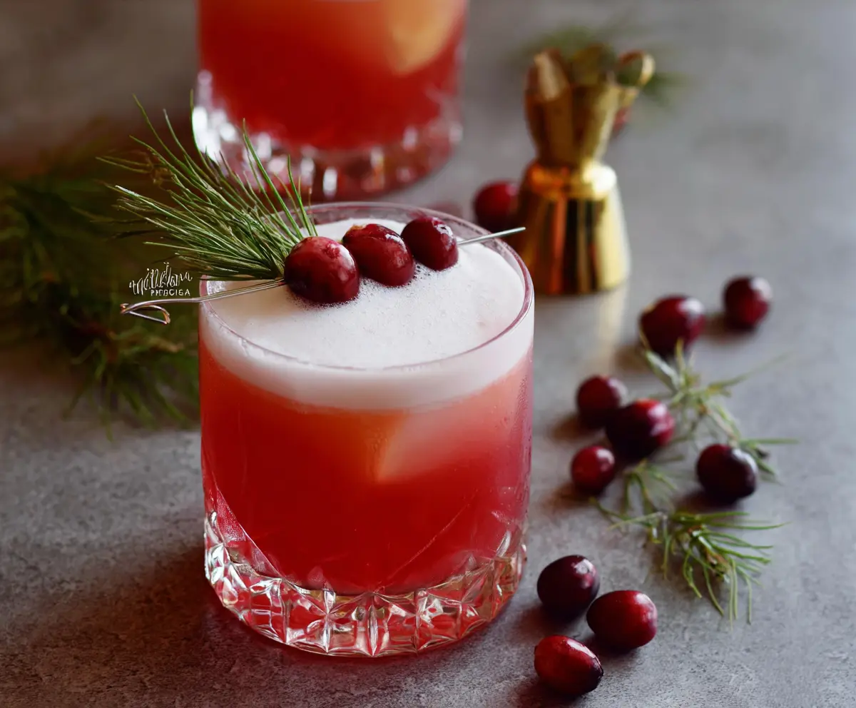 Add a fun garnish by skewering a few fresh cranberries on a cocktail pick and placing it on top of your glass. Add a slice of lemon and, if you like, a sprig of pine or rosemary for a festive touch.
