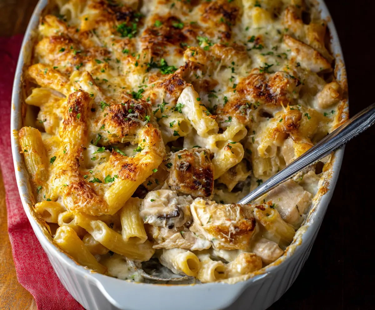 This Creamy Chicken Alfredo Pasta Bake is a warm hug in a dish! It’s filled with tender chicken, creamy Alfredo sauce, and pasta, all topped with gooey cheese that melts in your mouth.