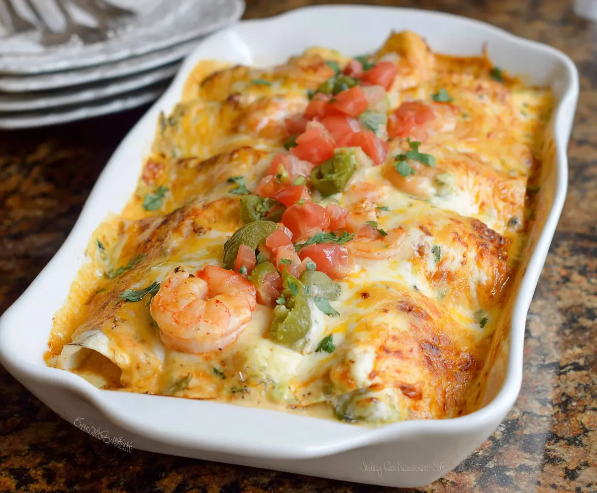 These creamy shrimp enchiladas are a tasty twist on a classic dish! Filled with shrimp and covered in a rich, cheesy sauce, they’re sure to please any seafood lover.