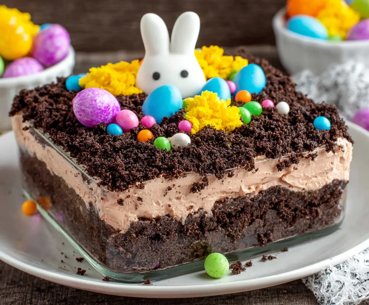 This Easter Dirt Cake is a fun and tasty treat that combines creamy chocolate pudding, fluffy whipped topping, and crunchy Oreo crumbs. It’s like dessert and a little adventure all in one!