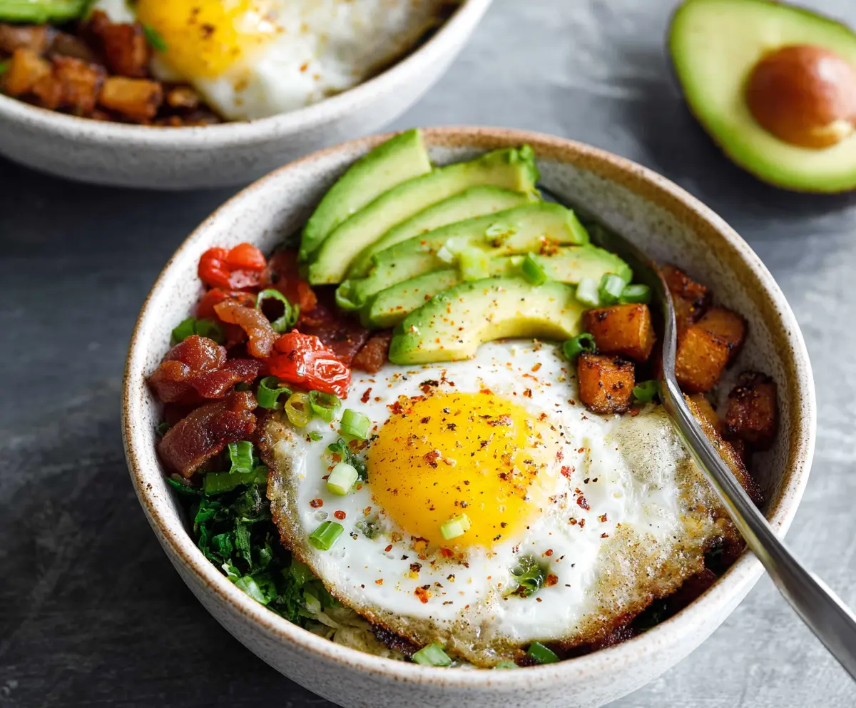 Leftover egg breakfast bowls can be stored in an airtight container in the fridge for up to 3 days. To reheat, warm gently on the stove or in the microwave, taking care to avoid overcooking the eggs.