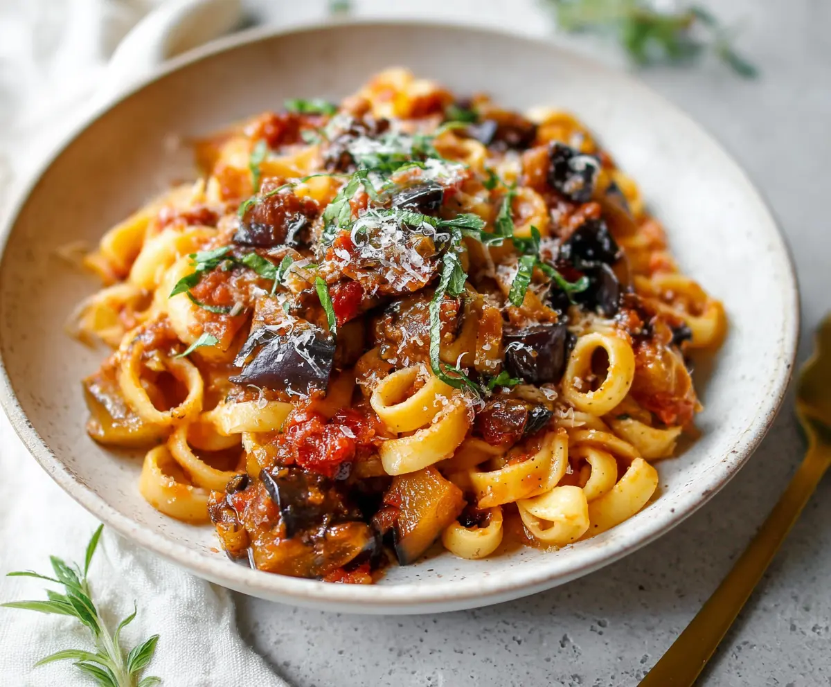 Creamy eggplant pasta served with fresh herbs and grated cheese, perfect for a vegetarian dinner.