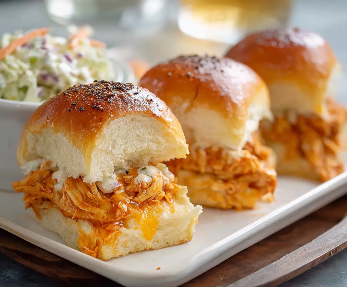 Delicious Fiery Buffalo Chicken Sliders Bake with spicy chicken and melted cheese on soft buns.