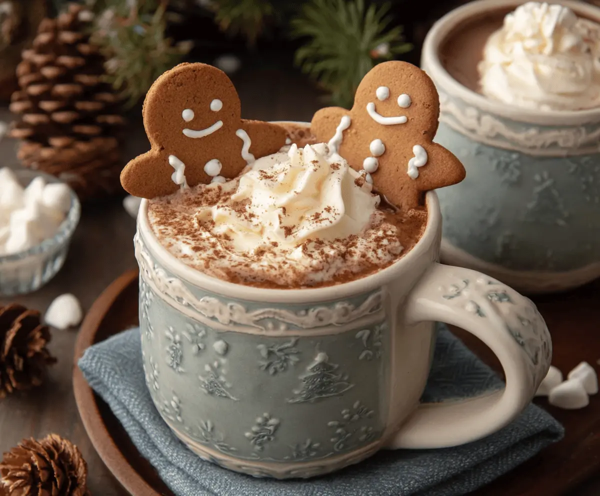 Pour the hot chocolate into mugs. Top each mug with a generous swirl of whipped cream. Then, sprinkle a little ground cinnamon or nutmeg on top for an aromatic kick. If you’d like, place a gingerbread cookie gently on top for that festive touch!
