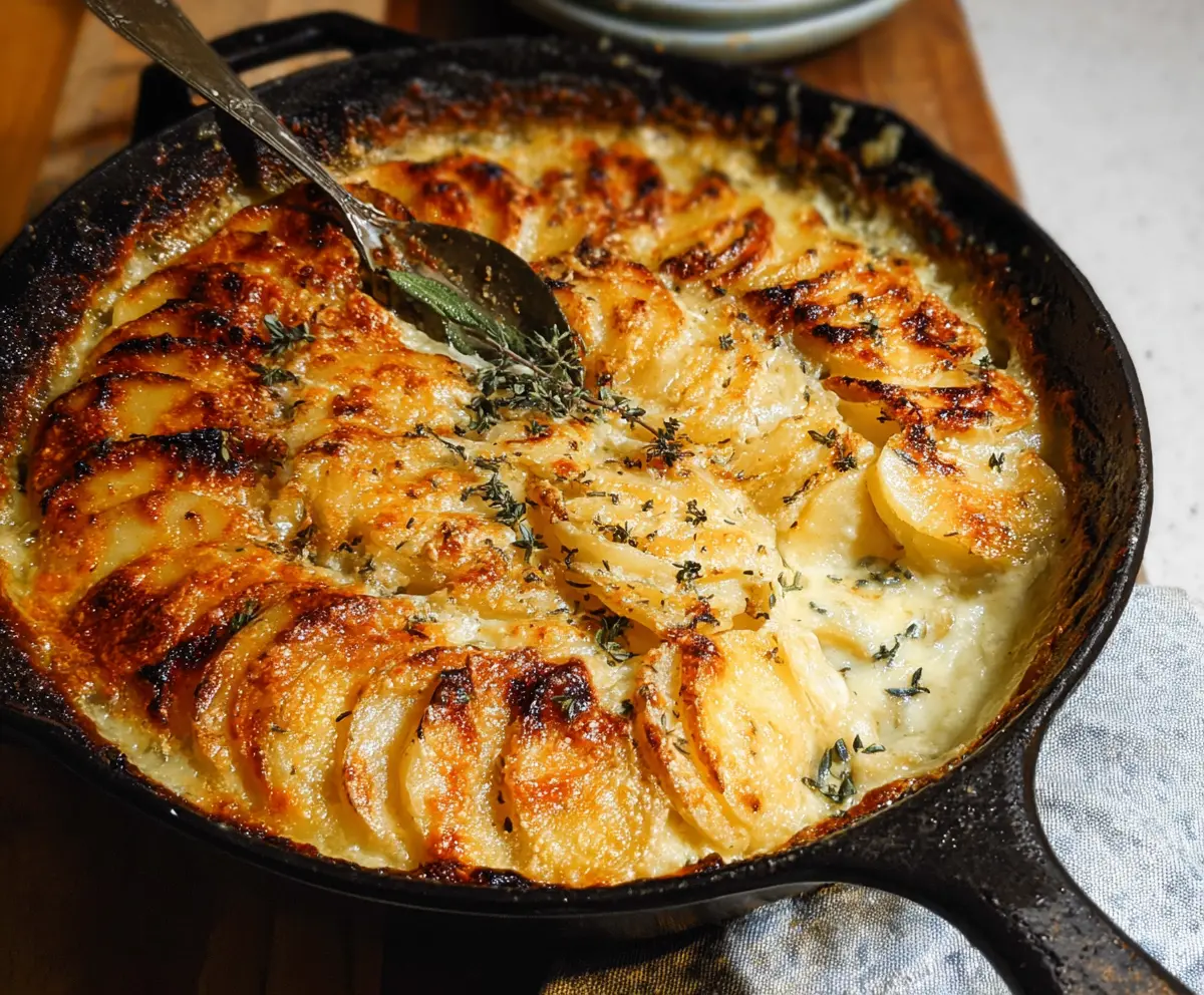 Garnish with some extra fresh thyme leaves for a pop of color and flavor. Serve warm and enjoy the creamy, cheesy, and aromatic layers of potato goodness!