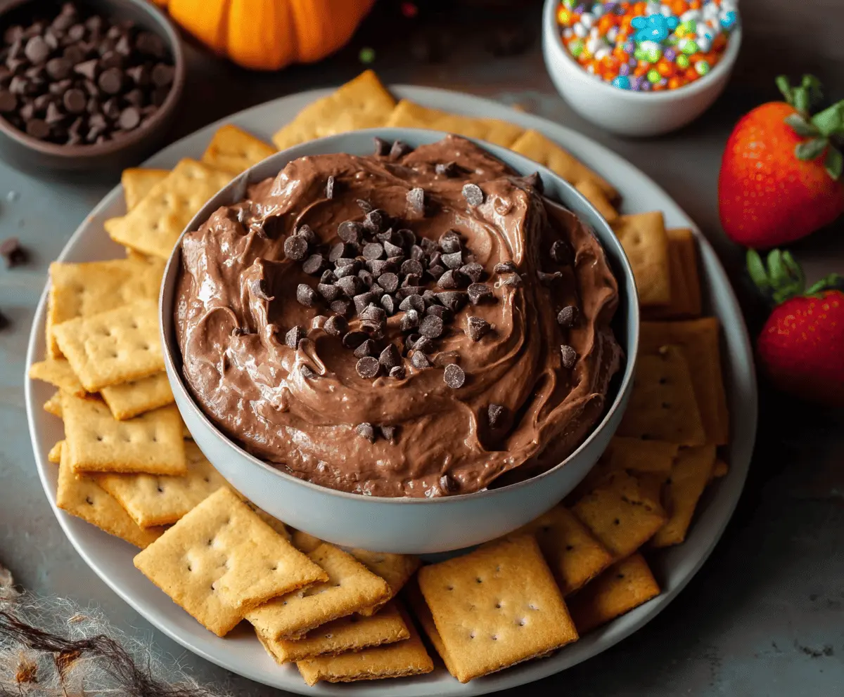Transfer your delicious dip to a serving bowl. For an extra chocolatey touch, sprinkle more mini chocolate chips on top. If you’re feeling festive, add some colorful Halloween-themed sprinkles for a fun look!