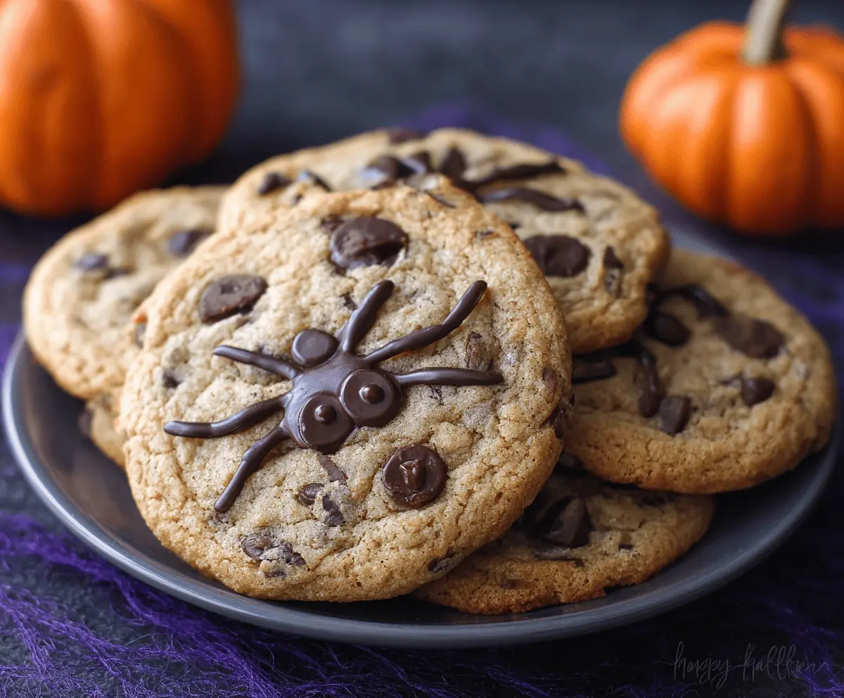 Halloween Chocolate Chip Cookies with Chocolate Spider Decoration