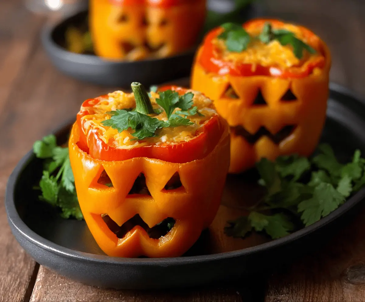Colorful Jack-O’-Lantern stuffed peppers filled with savory ingredients, perfect for Halloween-themed meals and festive dinners.
