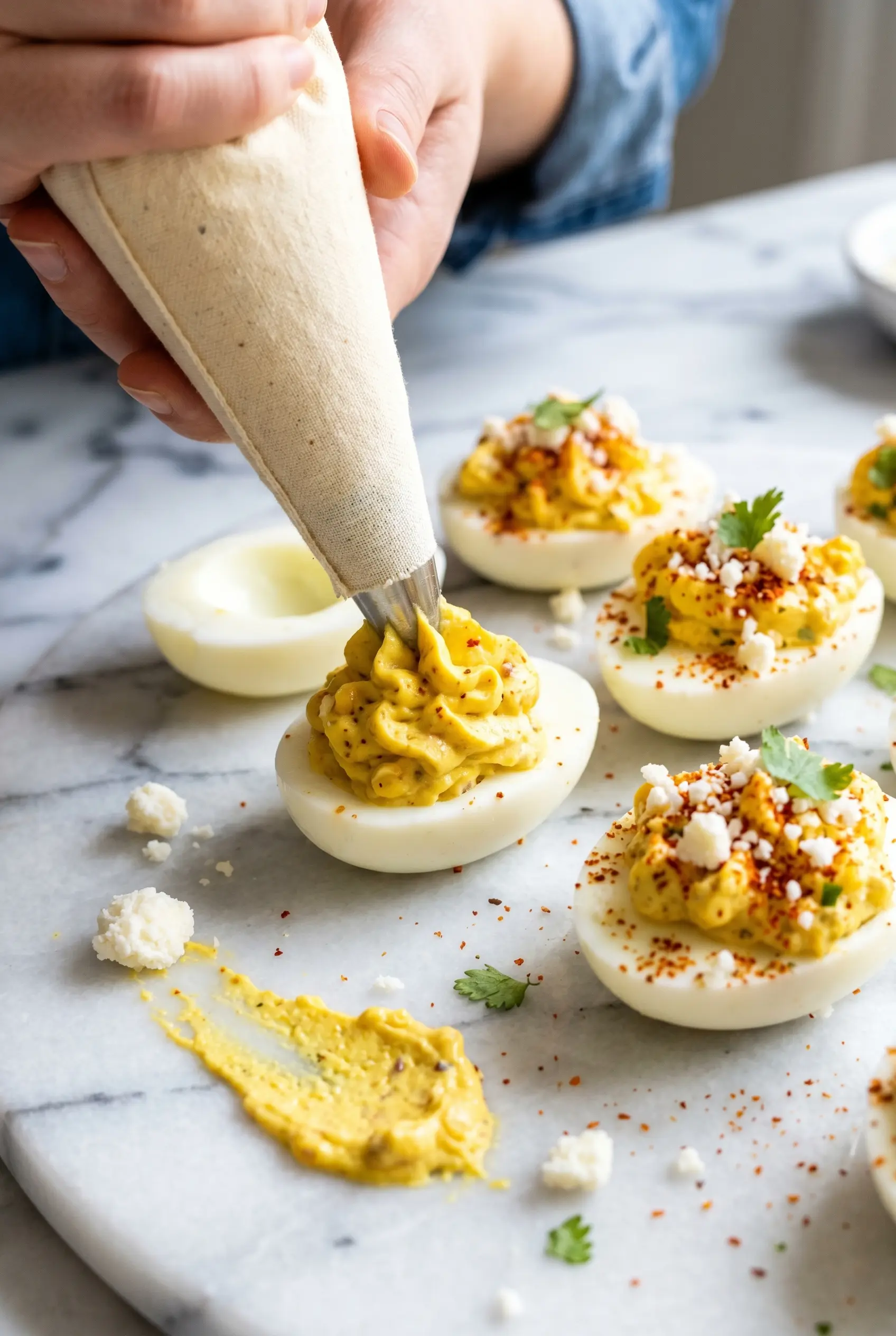 Add the charred corn, cotija, cilantro, green onions, and a light dusting of Cajun seasoning right before serving. If you garnish too early, the toppings start to slide and the eggs pick up moisture from the corn. Refrigerate them until serving time, but don’t bury them under plastic wrap touching the tops or you’ll flatten the garnish.