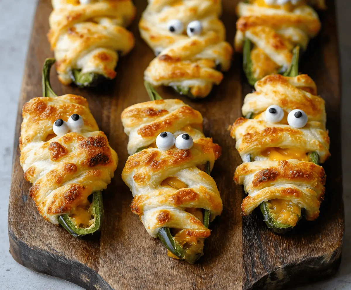 Spooky Mummy Jalapeño Poppers garnished with melted cheese and olive eyes, perfect for Halloween appetizers