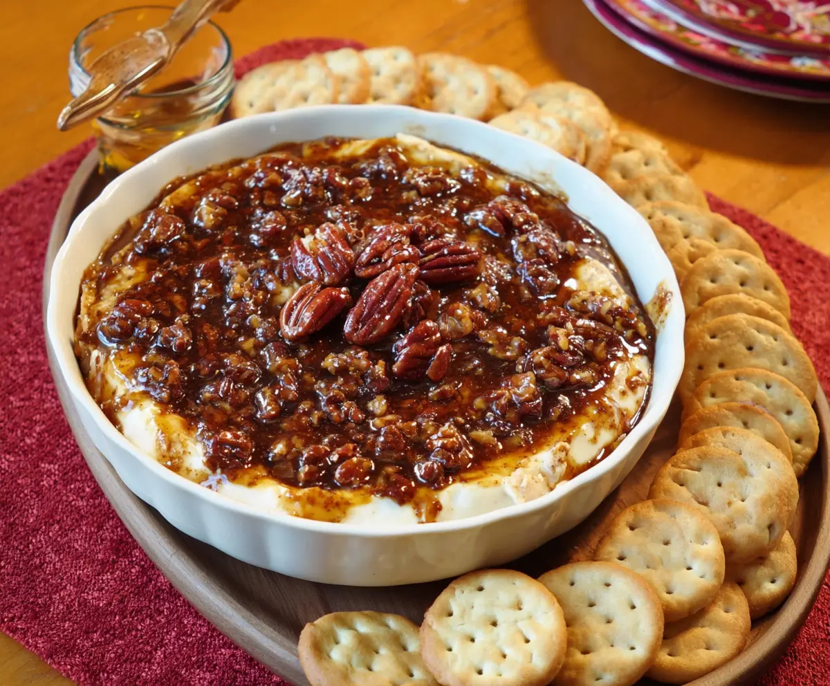When you’re ready to serve, grab some round crackers or graham crackers. Dip them into the creamy, sweet pecan dip and enjoy this tasty treat with your friends and family. It’s perfect for parties or as a dessert!