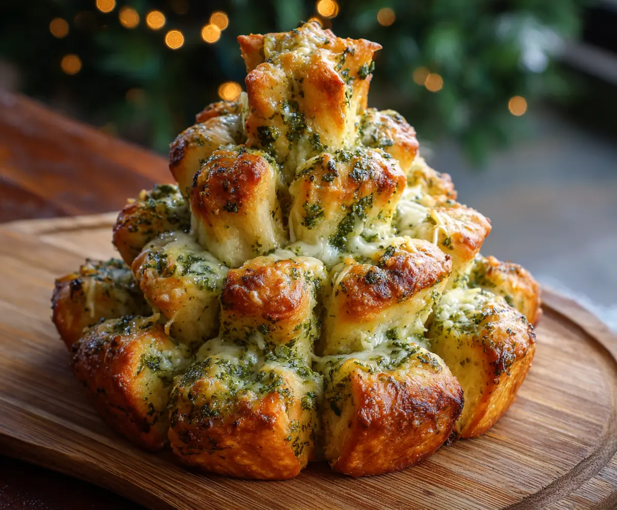 Festive pesto Christmas tree pull-apart bread with vibrant green basil pesto and golden baked layers for holiday celebration.