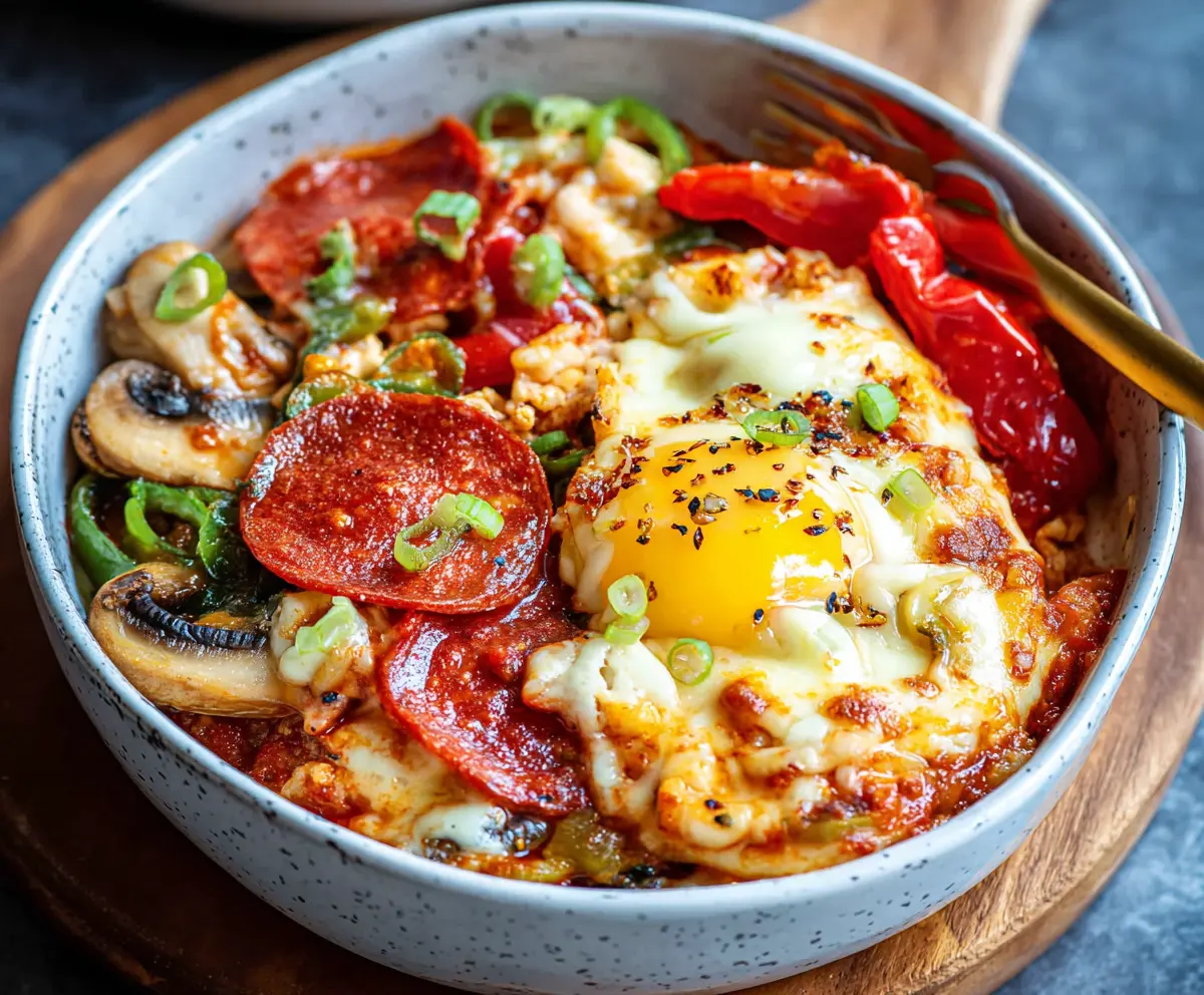 Delicious Pizza Protein Bowl featuring healthy ingredients and a cheesy topping.