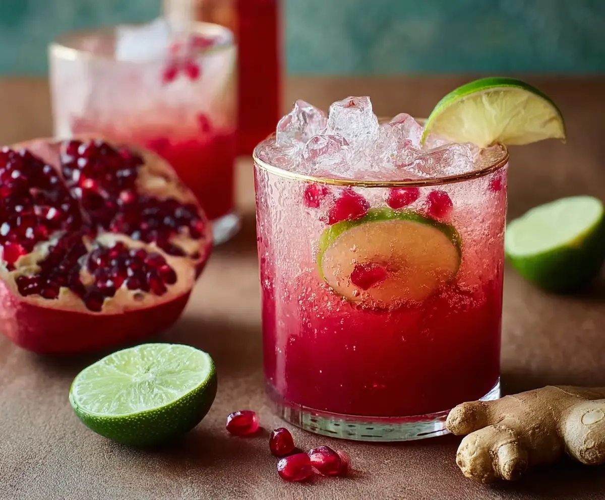 Refreshing Pomegranate Ginger Fizz cocktail with vibrant red pomegranate seeds and fresh ginger garnished in a stylish glass.