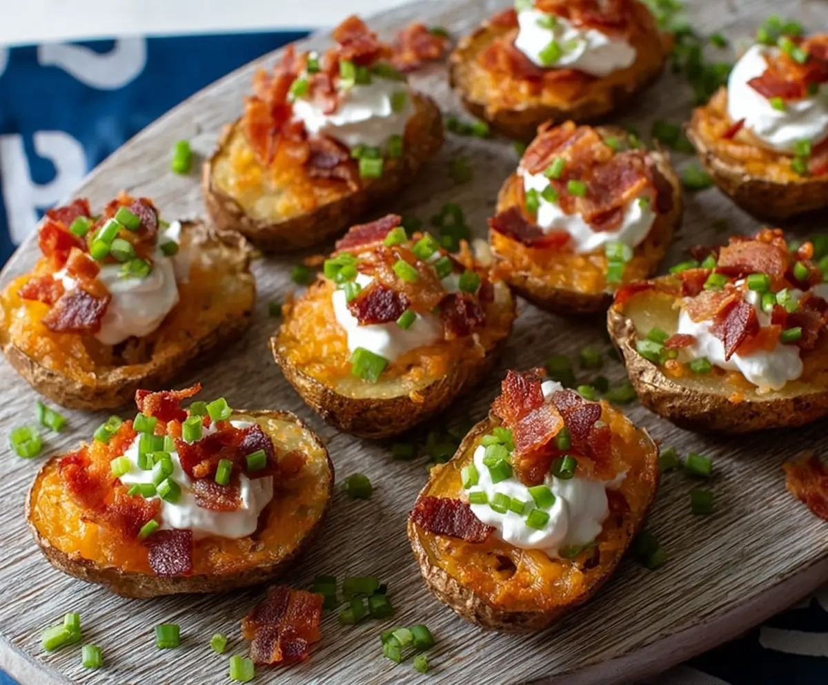 Crispy potato skin bites topped with cheese and herbs, perfect for snacks and appetizers.