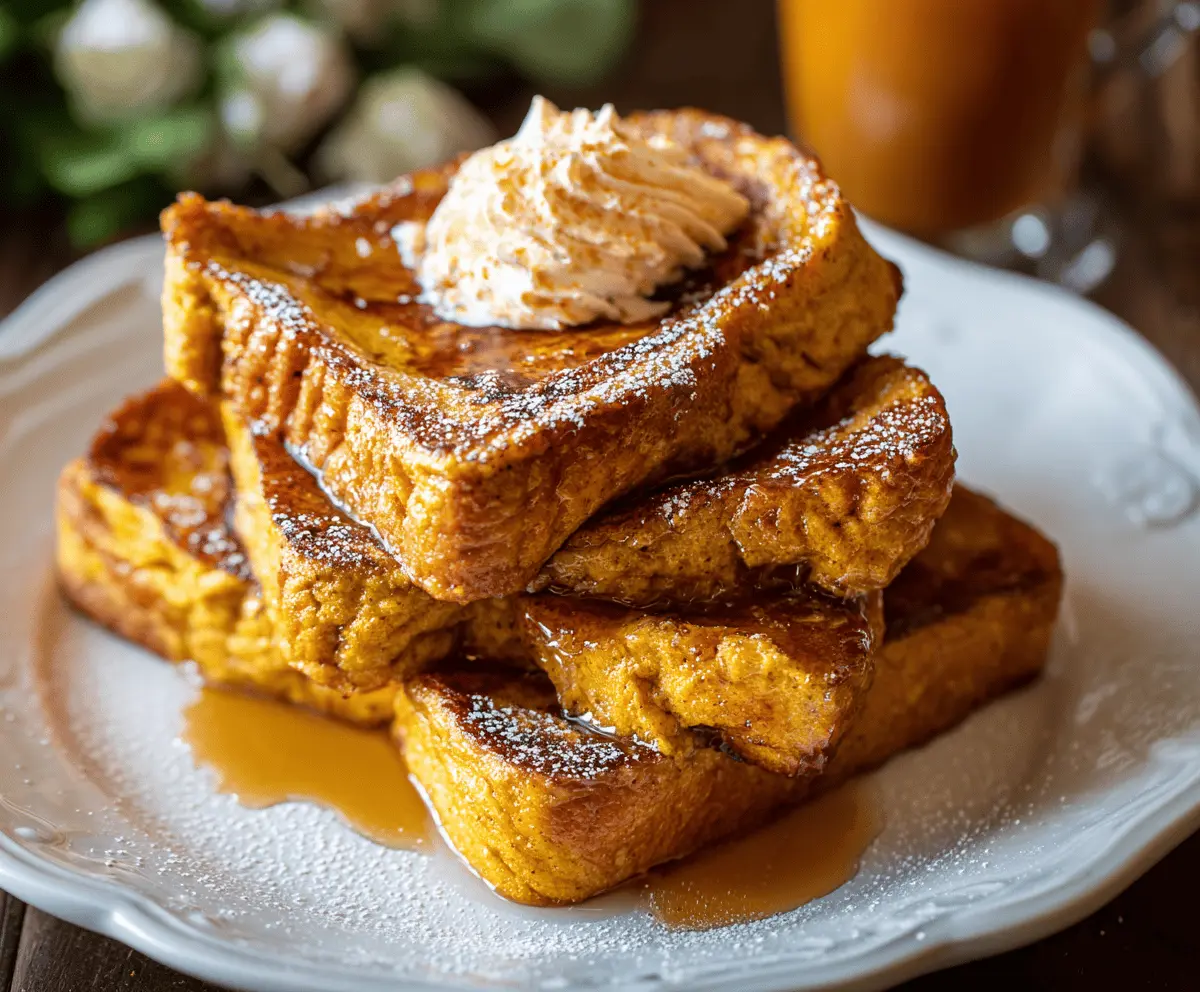 Stack the cooked Pumpkin French Toast on a plate. Dust with powdered sugar, drizzle with maple syrup, and add a generous swirl of whipped cream on top for that extra indulgence!