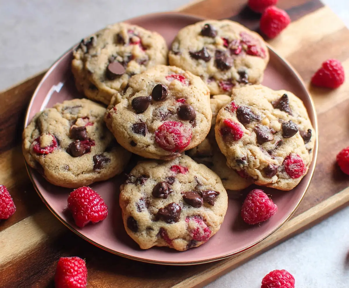 Delicious Raspberry Almond Chocolate Chip Cookies fresh out of the oven, showcasing a golden-brown exterior and visible raspberry, almond, and chocolate chunks.