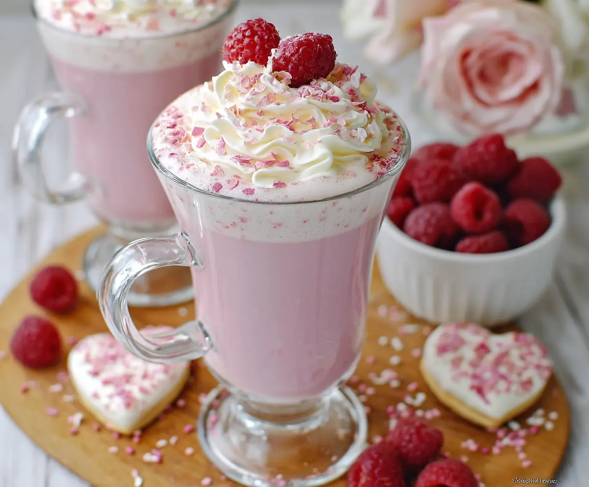 Top your delicious drink with a generous swirl of whipped cream. For a fun and fancy touch, garnish with fresh raspberries. If you want, sprinkle some freeze-dried raspberry powder or crushed freeze-dried raspberries, and add some pink sprinkles or white chocolate shavings on top.