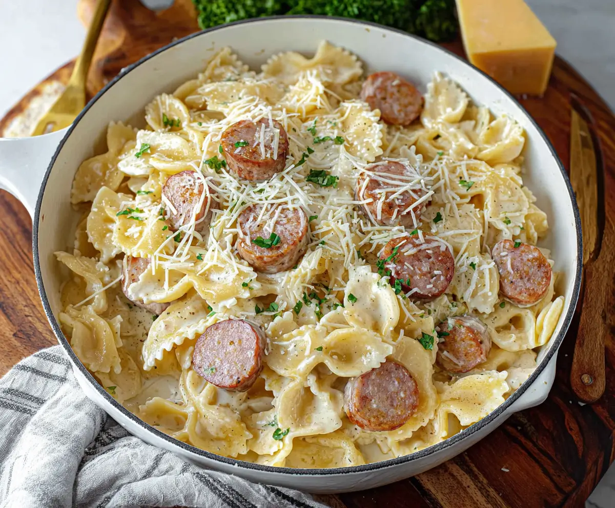 Let the dish cook together for another 2-3 minutes to meld those delicious flavors. When you’re ready to serve, sprinkle some freshly chopped parsley and extra Parmesan cheese on top for a yummy touch. Enjoy your creamy, flavorful Sausage Alfredo Pasta hot!