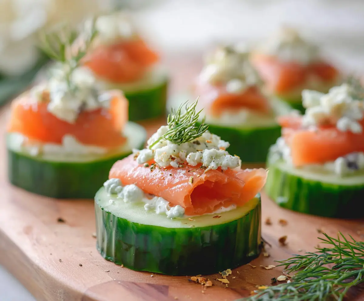 Delicious smoked salmon cucumber bites garnished with fresh herbs, perfect for parties and appetizers.