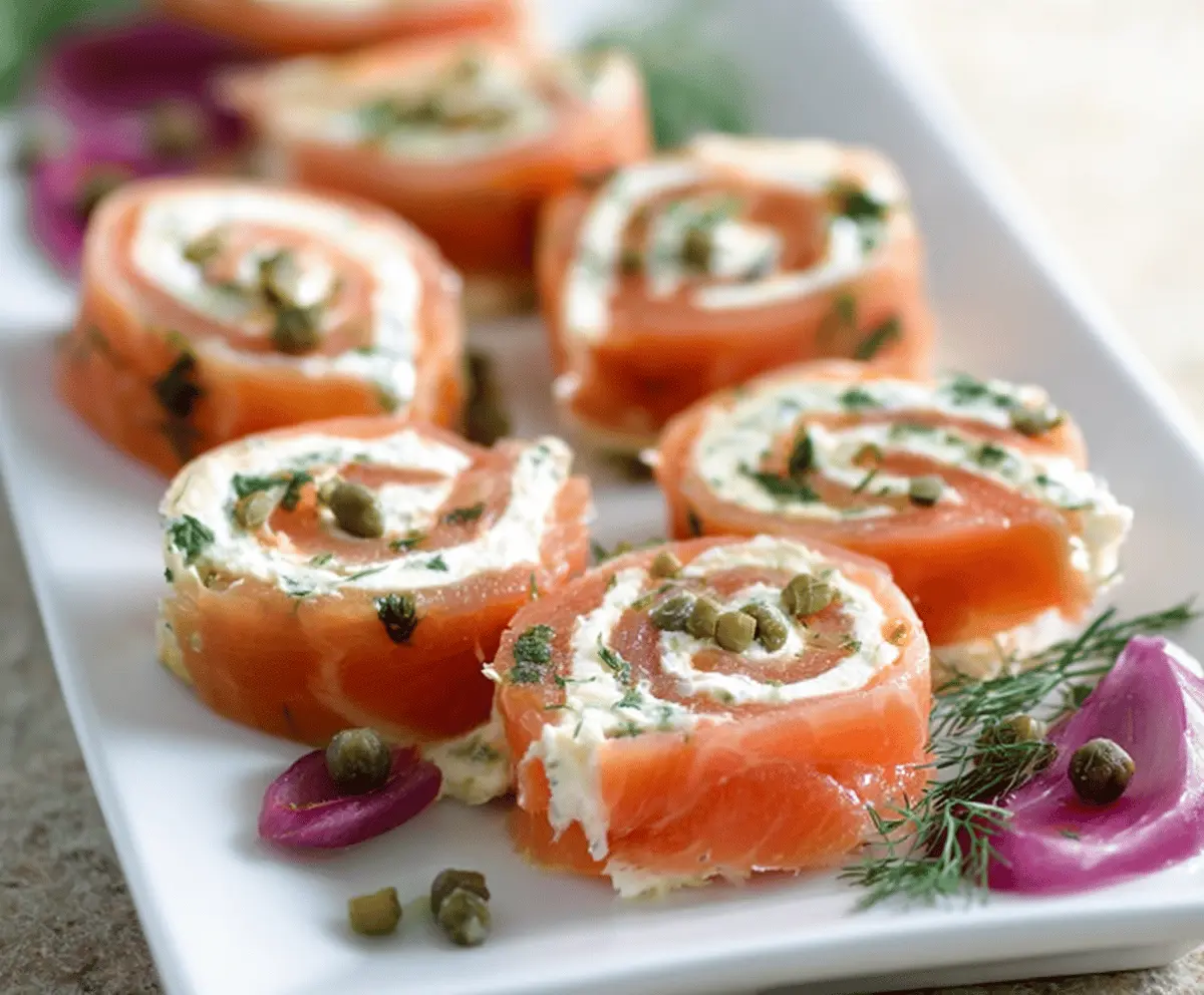 Delicious smoked salmon pinwheels with cream cheese and fresh herbs on a serving platter.