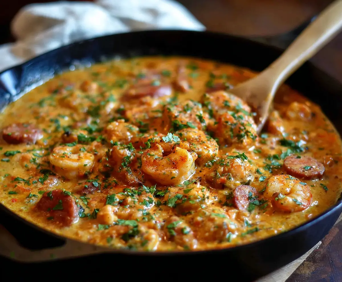 Garnish your delicious dish with chopped fresh parsley. Serve hot over a bed of cooked white rice, making sure to spoon plenty of that rich sauce over the shrimp and sausage. Enjoy this comforting, creamy dish!