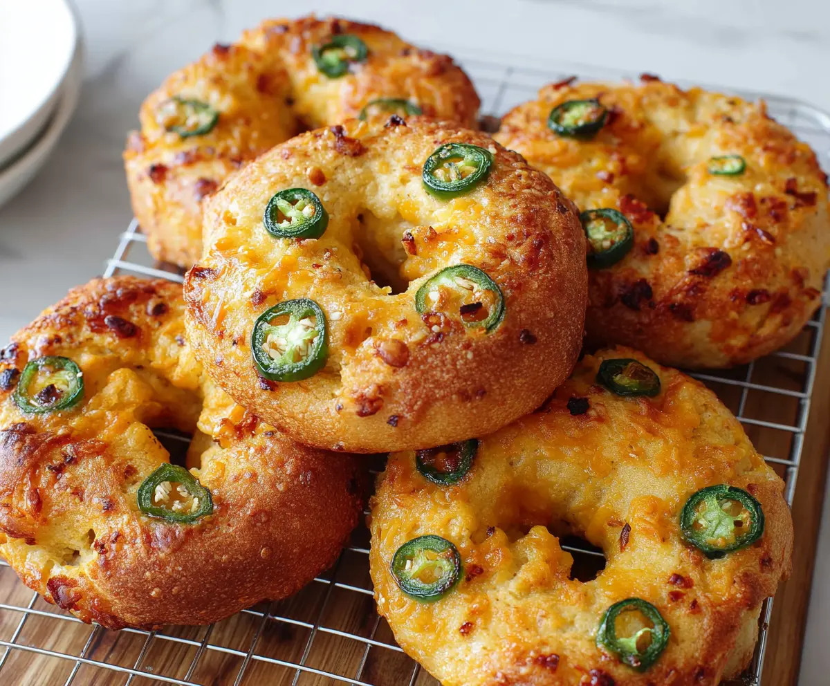 Delicious spicy jalapeño cheddar bagels with melted cheese and fresh jalapeños on top.