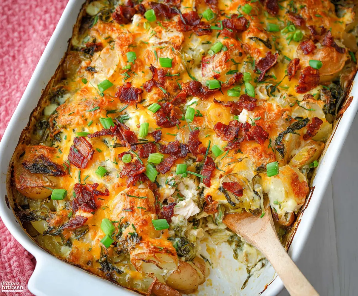 Garnish with some extra chopped green onions, then dish it up warm! Enjoy your hearty and flavorful Spring Veggie Loaded Chicken Potato Casserole!